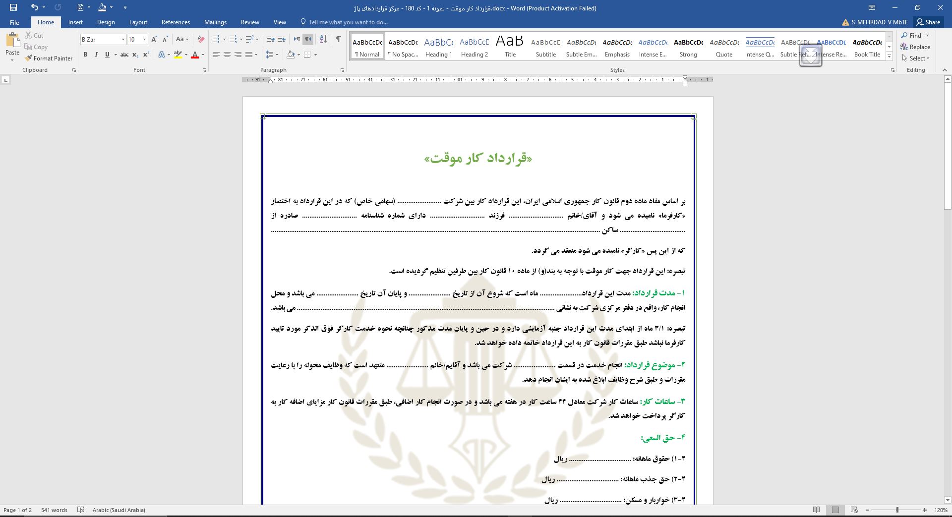 - شامل بندهای کامل درباره مدت قرارداد، وظایف، حقوق و مزایا، شرایط فسخ و تعهدات طرفین